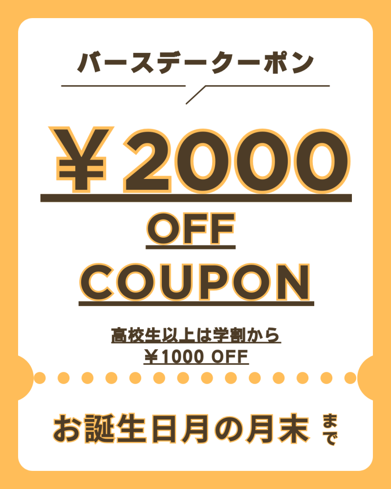 お誕生日月の1カ月間が有効期限です※クーポンはご本人様のみご使用となります※1回のみのご使用となります※高校生以上の学生の方は学割から¥1000引きのご利用となります※中学生以下の方はご利用できません※プチメニュー&商品のご購入はご利用できません※各種サービス券の併用はできません※換金はできません